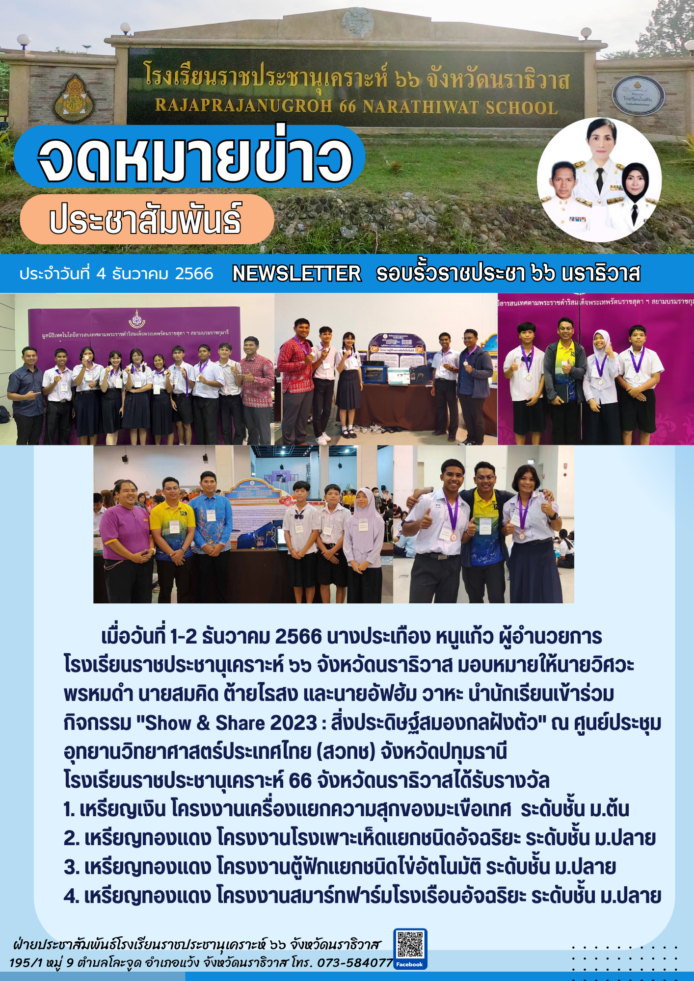 เมื่อวันที่ 1-2 ธันวาคม 2566 นางประเทือง หนูแก้ว ผู้อำนวยการโรงเรียนราชประชานุเคราะห์ ๖๖ จังหวัดนราธิวาส มอบหมายให้นายวิศวะ พรหมดำ นายสมคิด ต้ายไธสง และนายอัฟฮัม วาหะ นำนักเรียนเข้าร่วมกิจกรรม "Show