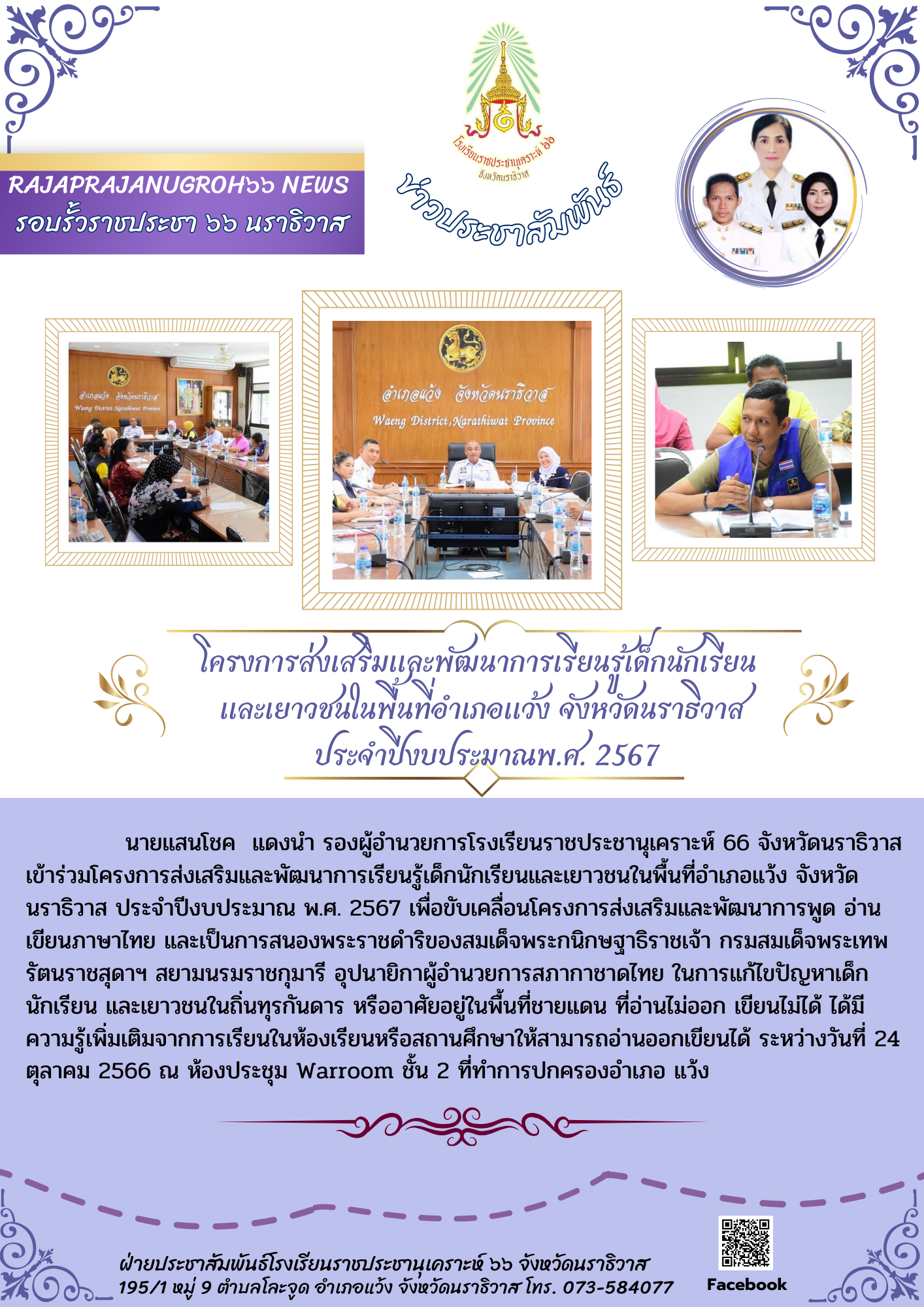 โครงการส่งเสริมและพัฒนาการเรียนรู้เด็กนักเรียน และเยาวชนในพื้นที่อำเภอแว้ง จังหวัดนราธิวาส ประจำปีงบประมาณพ.ศ. 2567