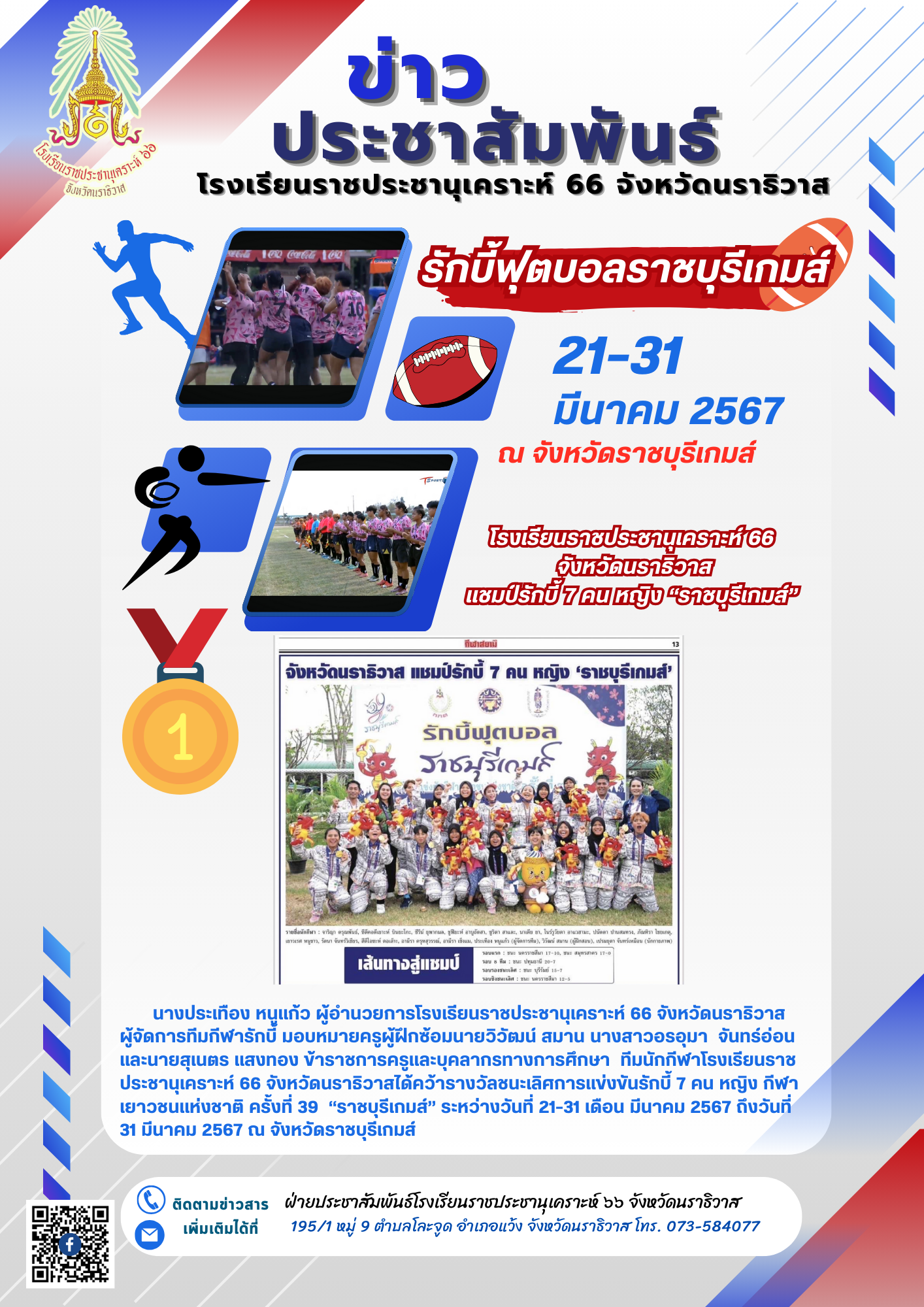 ผู้จัดการทีมกีฬารักบี้ มอบหมายครูผู้ฝึกซ้อมนายวิวัฒน์ สมาน นางสาวอรอุมา จันทร์อ่อน และนายสุเนตร แสงทอง ข้าราชการครูและบุคลากรทางการศึกษา ทีมนักกีฬาโรงเรียนราชประชานุเคราะห์ 66 จังหวัดนราธิวาสได้คว้ารางวัลชนะเลิศการแข่งขันรักบี้ 7 คน หญิง กีฬาเยาวชนแห่งชาติ ครั้งที่ 39 “ราชบุรีเกมส์” ระหว่างวันที่ 21-31 เดือน มีนาคม 2567 ถึงวันที่ 31 มีนาคม 2567 ณ จังหวัดราชบุรีเกมส์