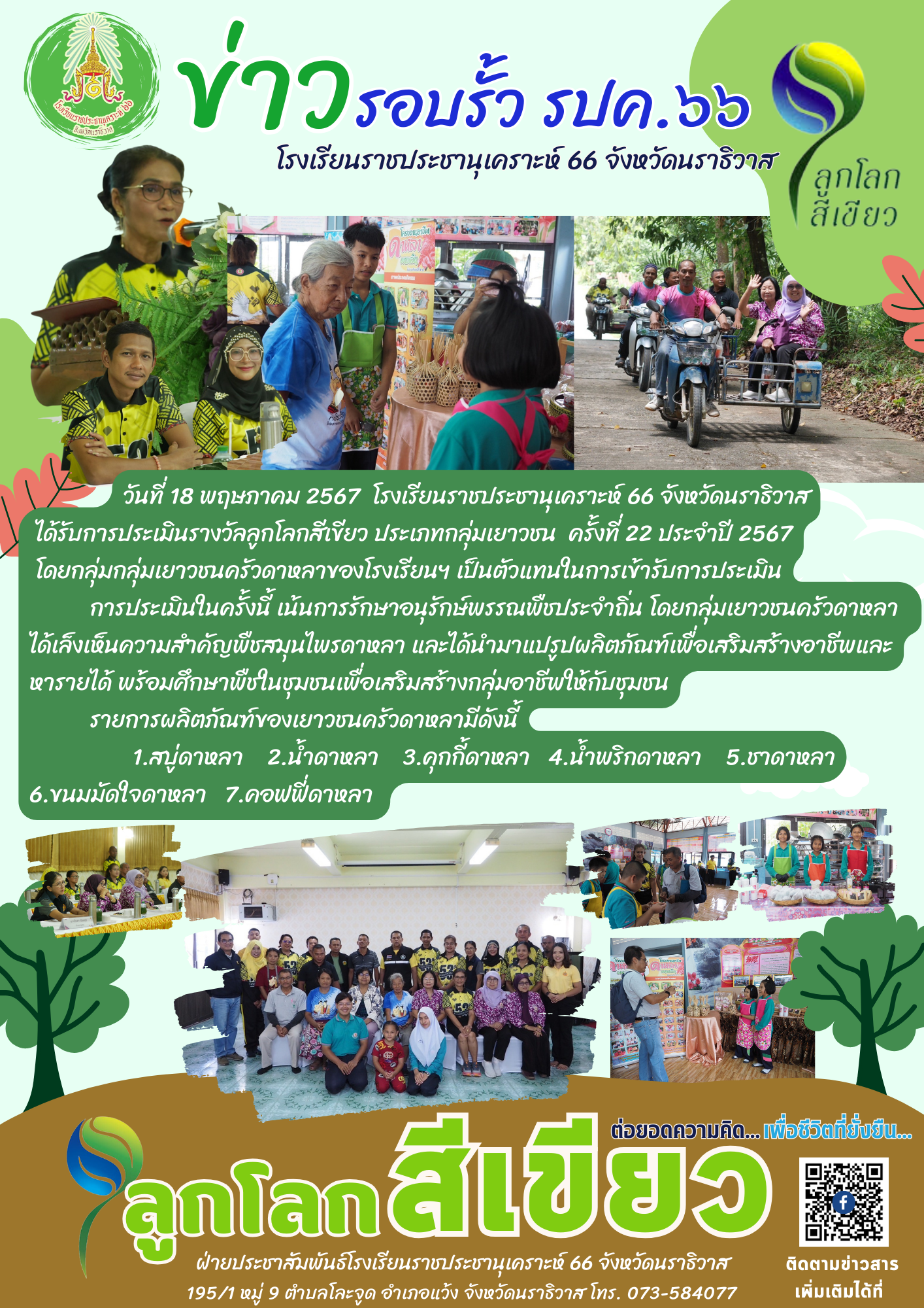 วันที่ 18 พฤษภาคม 2567 โรงเรียนราชประชานุเคราะห์ 66 จังหวัดนราธิวาส ได้รับการประเมินรางวัลลูกโลกสีเขียว ประเภทกลุ่มเยาวชน ครั้งที่ 22 ประจำปี 2567 โดยกลุ่มกลุ่มเยาวชนครัวดาหลาของโรงเรียนฯ เป็นตัวแ