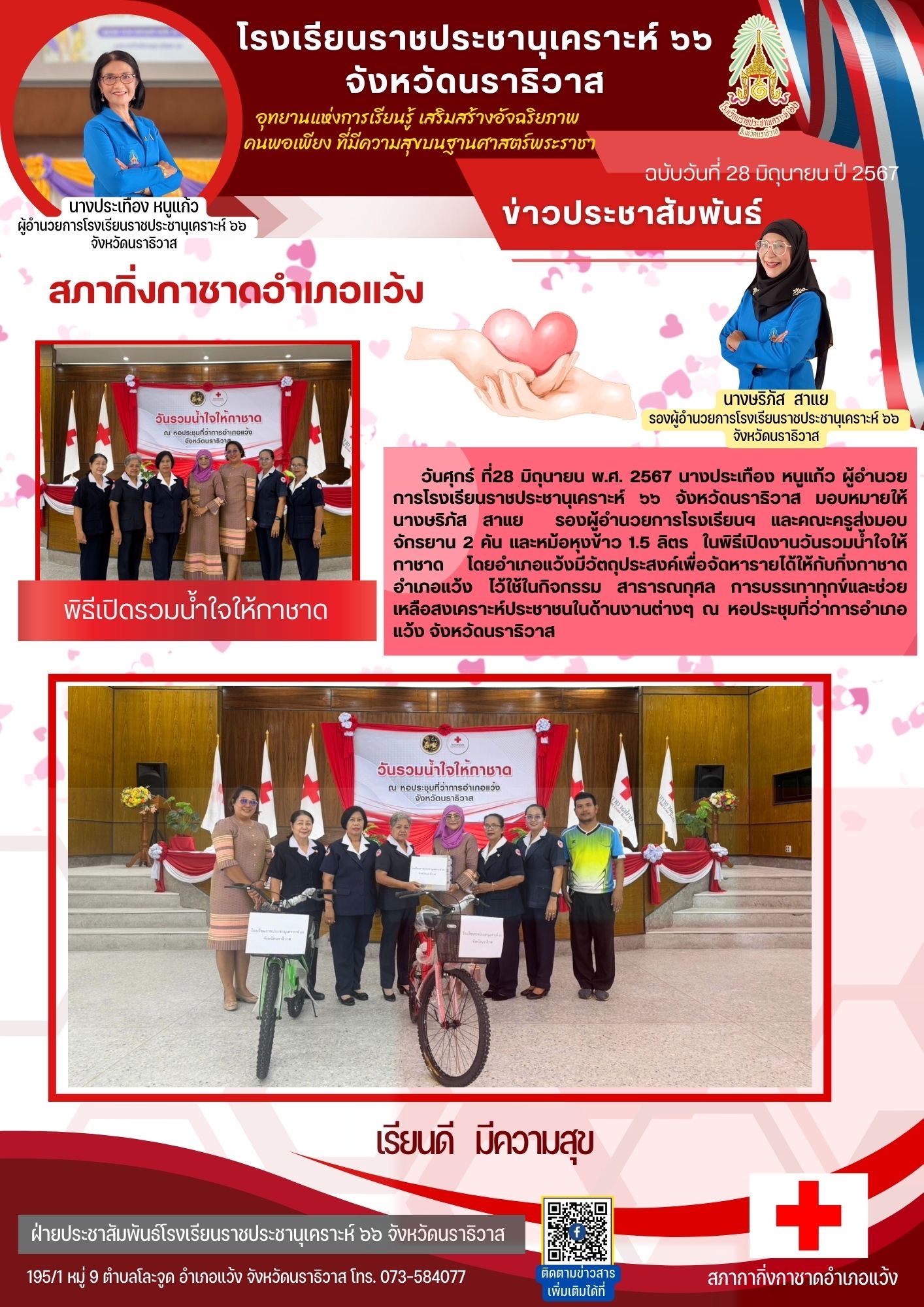 วันศุกร์ ที่28 มิถุนายน พ.ศ. 2567 นางประเทือง หนูแก้ว ผู้อำนวยการโรงเรียนราชประชานุเคราะห์ ๖๖ จังหวัดนราธิวาส มอบหมายให้นางษริภัส สาแย รองผู้อำนวยการโรงเรียนฯ และคณะครูส่งมอบจักรยาน 2 คัน และหม้อหุงข้าว 1.5 ลิตร ในพิธีเปิดงานวันรวมน้ำใจให้กาชาด โดยอำเภอแว้งมีวัตถุประสงค์เพื่อจัดหารายได้ให้กับกิ่งกาชาดอำเภอแว้ง ไว้ใช้ในกิจกรรม สาธารณกุศล การบรรเทาทุกข์และช่วยเหลือสงเคราะห์ประชาชนในด้านงานต่างๆ ณ หอประชุมที่ว่าการอำเภอแว้ง จังหวัดนราธิวาส