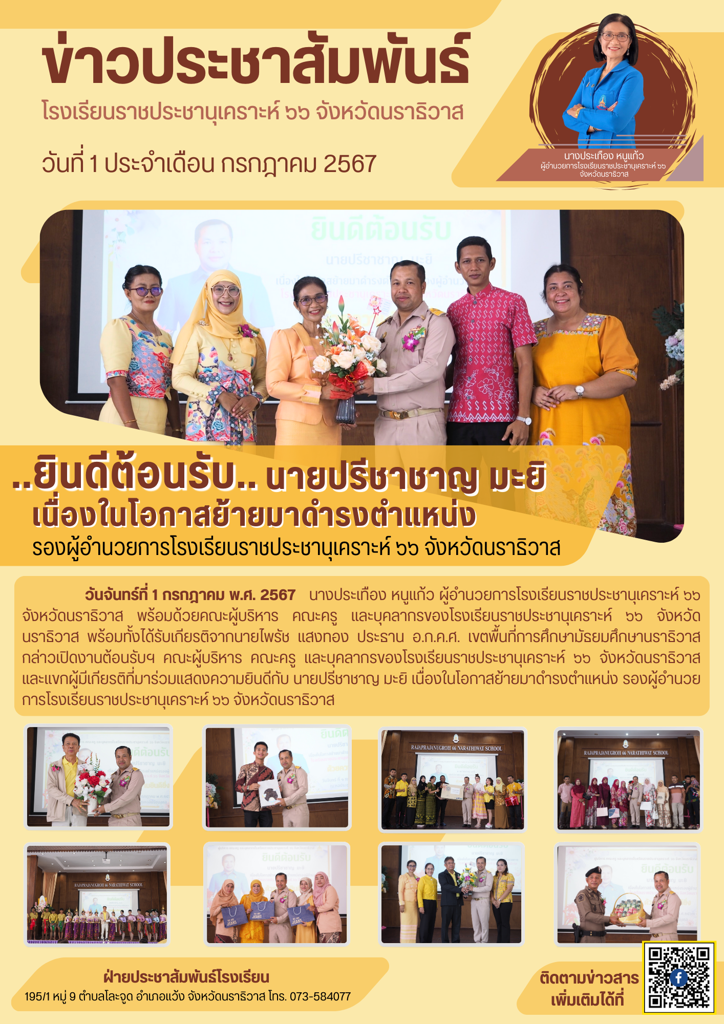 วันจันทร์ที่ 1 กรกฎาคม พ.ศ. 2567 นางประเทือง หนูแก้ว ผู้อำนวยการโรงเรียนราชประชานุเคราะห์ ๖๖ จังหวัดนราธิวาส พร้อมด้วยคณะผู้บริหาร คณะครู และบุคลากรของโรงเรียนราชประชานุเคราะห์ ๖๖ จังหวัดนราธิวาส พร้อมทั้งได้รับเกียรติจากนายไพรัช แสงทอง ประธาน อ.ก.ค.ศ. เขตพื้นที่การศึกษามัธยมศึกษานราธิวาส กล่าวเปิดงานต้อนรับฯ คณะผู้บริหาร คณะครู และบุคลากรของโรงเรียนราชประชานุเคราะห์ ๖๖ จังหวัดนราธิวาส และแขกผู้มีเกียรติที่มาร่วมแสดงความยินดีกับ นายปรีชาชาญ มะยิ เนื่องในโอกาสย้ายมาดำรงตำแหน่ง รองผู้อำนวยการโรงเรียนราชประชานุเคราะห์ ๖๖ จังหวัดนราธิวาส