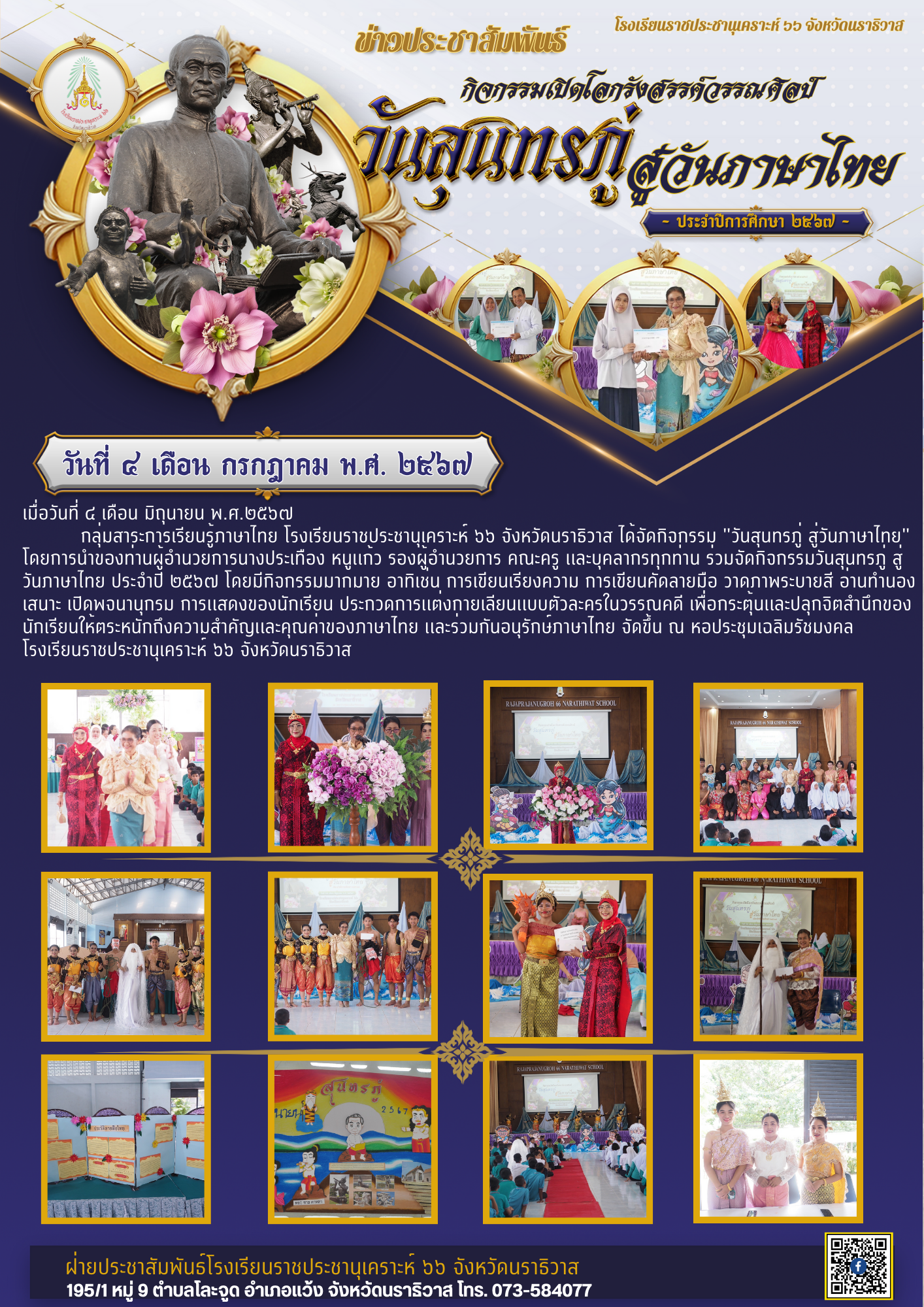กลุ่มสาระการเรียนรู้ภาษาไทย โรงเรียนราชประชานุเคราะห์ ๖๖ จังหวัดนราธิวาส ได้จัดกิจกรรม "วันสุนทรภู่ สู่วันภาษาไทย" โดยการนำของท่านผู้อำนวยการนางประเทือง หนูแก้ว รองผู้อำนวยการ คณะครู และบุคลากรทุกท่าน ร่วมจัดกิจกรรมวันสุนทรภู่ สู่วันภาษาไทย ประจำปี ๒๕๖๗ โดยมีกิจกรรมมากมาย อาทิเช่น การเขียนเรียงความ การเขียนคัดลายมือ วาดภาพระบายสี อ่านทำนองเสนาะ เปิดพจนานุกรม การแสดงของนักเรียน ประกวดการแต่งกายเลียนแบบตัวละครในวรรณคดี เพื่อกระตุ้นและปลุกจิตสำนึกของนักเรียนให้ตระหนักถึงความสำคัญและคุณค่าของภาษาไทย และร่วมกันอนุรักษ์ภาษาไทย จัดขึ้น ณ หอประชุมเฉลิมรัชมงคล โรงเรียนราชประชานุเคราะห์ ๖๖ จังหวัดนราธิวาส