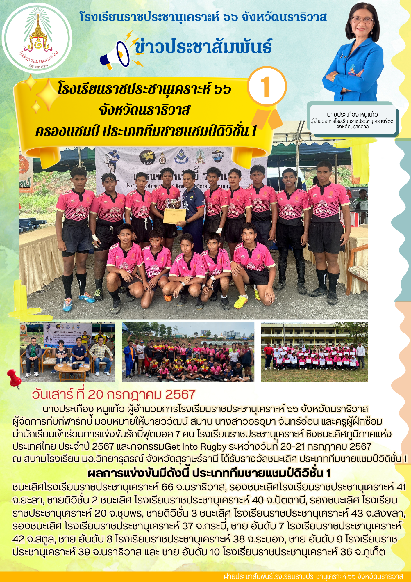 วันเสาร์ ที่ 20 กรกฎาคม 2567 ผลการแข่งขันมีดังนี้ ประเภททีมชายแชมป์ดิวิชั่น 1 ชนะเลิศโรงเรียนราชประชานุเคราะห์ 66 จ.นราธิวาส