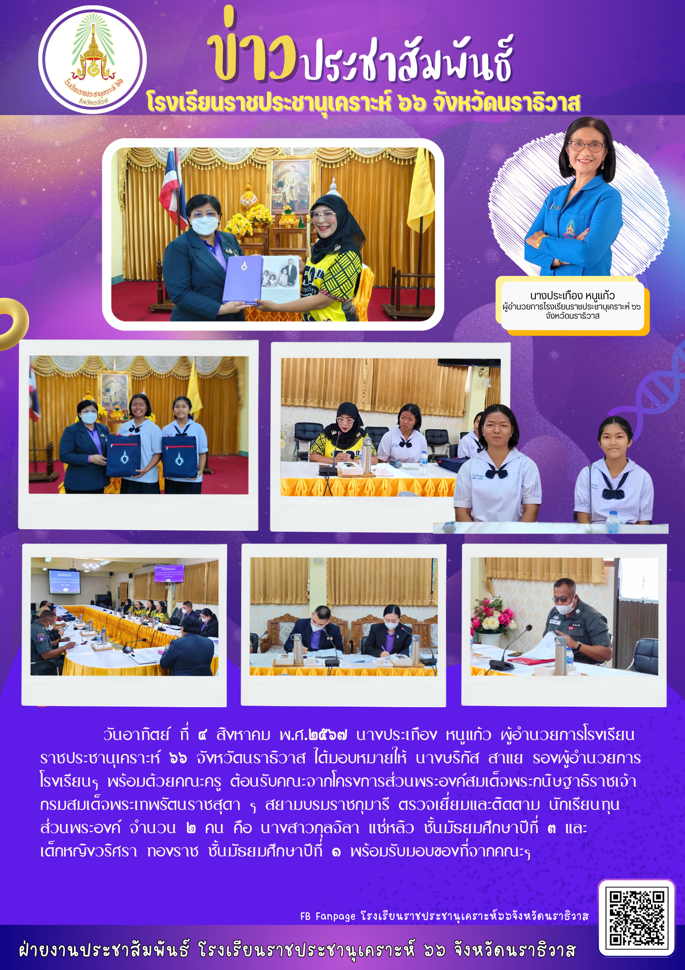 วันอาทิตย์ ที่ ๔ สิงหาคม พ.ศ.๒๕๖๗ นางประเทือง หนูแก้ว ผู้อำนวยการโรงเรียนราชประชานุเคราะห์ ๖๖ จังหวัดนราธิวาส ได้มอบหมายให้ นางษริภัส สาแย รองผู้อำนวยการโรงเรียนฯ พร้อมด้วยคณะครู ต้อนรับคณะจากโครงการส่วนพระองค์สมเด็จพระกนิษฐาธิราชเจ้า กรมสมเด็จพระเทพรัตนราชสุดา ฯ สยามบรมราชกุมารี ตรวจเยี่ยมและติดตาม นักเรียนทุนส่วนพระองค์ จำนวน ๒ คน คือ นางสาวกุลจิลา แซ่หลิว ชั้นมัธยมศึกษาปีที่ ๓ และ