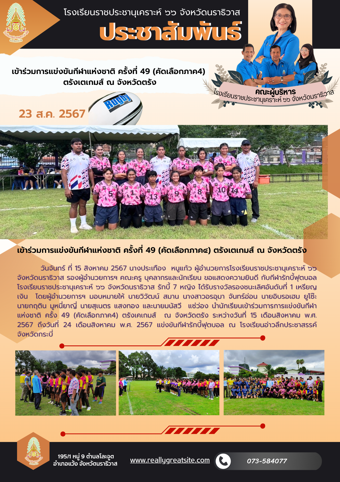 วันจันทร์ ที่ 15 สิงหาคม 2567 นางประเทือง หนูแก้ว ผู้อำนวยการโรงเรียนราชประชานุเคราะห์ ๖๖ จังหวัดนราธิวาส รองผู้อำนวยการฯ คณะครู บุคลากรและนักเรียน ขอแสดงความยินดี กับกีฬารักบี้ฟุตบอล โรงเรียนราชประชานุเคราะห์ ๖๖ จังหวัดนราธิวาส รักบี้ 7 หญิง ได้รับรางวัลรองชนะเลิศอันดับที่ 1 เหรียญเงิน โดยผู้อำนวยการฯ มอบหมายให้ นายวิวัฒน์ สมาน นางสาวอรอุมา จันทร์อ่อน นายอิบรอเฮม ยูโซ๊ะ นายกฤติน มูหนี่ยาญี่ นายสุเนตร แสงทอง และนายมนัสวี แซ่ว่อง นำนักเรียนเข้าร่วมการการแข่งขันกีฬาแห่งชาติ ครั้ง 49 (คัดเลือกภาค4) ตรังเคเกมส์ ณ จังหวัดตรัง ระหว่างวันที่ 15 เดือนสิงหาคม พ.ศ. 2567 ถึงวันที่ 24 เดือนสิงหาคม พ.ศ. 2567 แข่งขันกีฬารักบี้ฟุตบอล ณ โรงเรียนอ่าวลึกประชาสรรค์ จังหวัดกระบี่