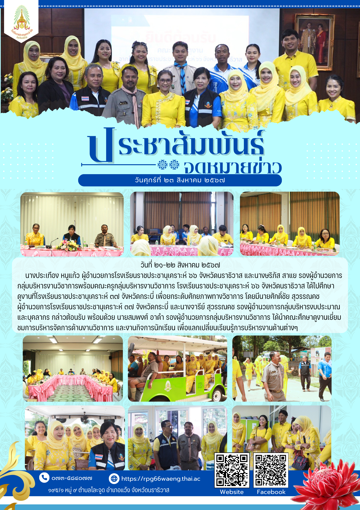 วันที่ ๒๑-๒๒ สิงหาคม ๒๕๖๗ นางประเทือง หนูแก้ว ผู้อำนวยการโรงเรียนราชประชานุเคราะห์ ๖๖ จังหวัดนราธิวาส และนางษริภัส สาแย รองผู้อำนวยการ กลุ่มบริหารงานวิชาการพร้อมคณะครูกลุ่มบริหารงานวิชาการ โรงเรียนราชประชานุเคราะห์ ๖๖ จังหวัดนราธิวาส ได้ไปศึกษา ดูงานที่โรงเรียนราชประชานุเคราะห์ ๓๗ จังหวัดกระบี่ เพื่อยกระดับศักยภาพทางวิชาการ โดยมีนายศักดิ์ชัย สุวรรณคช ผู้อำนวยการโรงเรียนราชประชานุเคราะห์ ๓๗ จังหวัดกระบี่ และนางจารีย์ สุวรรณคช รองผู้อำนวยการกลุ่มบริหารงบประมาณและบุคลากร กล่าวต้อนรับ พร้อมด้วย นายสมพงศ์ อาดำ รองผู้อำนวยการกลุ่มบริหารงานวิชาการ ได้นำคณะศึกษาดูงานเยี่ยมชมการบริหารจัดการด้านงานวิชาการ และงานกิจการนักเรียน เพื่อแลกเปลี่ยนเรียนรู้การบริหารงานด้านต่างๆ