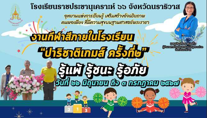 กลุ่มสาระการเรียนรู้สุขศึกษาและพลศึกษา โรงเรียนราชประชานุเคราะห์ ๖๖ จังหวัดนราธิวาส ได้จัดกิจกรรมกีฬาสีภายในโรงเรียน โดยการนำของท่านผู้อำนวยการนางประเทือง หนูแก้ว รองผู้อำนวยการ คณะครู และบุคลากรทุกท่าน ร่วมจัดกิจกรรมกีฬาสีภายในโรงเรียน “ปาริชาติเกมส์ ครั้งที่ ๒” ประจำปี ๒๕๖๗ โดยมีนายประยุทธ ทองพุ่ม นายอำเภอแว้ง ให้เกียรติมาเป็นประธานในพิธีเปิด ในการแข่งขันกีฬาสีภายในโรงเรียน มีการประกวดกองเชียร์ เชียร์ลีดเดอร์ และกีฬาต่างๆ เพื่อส่งเสริมให้นักเรียนมีความกล้าแสดงออกอย่างสร้างสรรค์ สร้างความรัก ความสามัคคีในหมู่คณะ